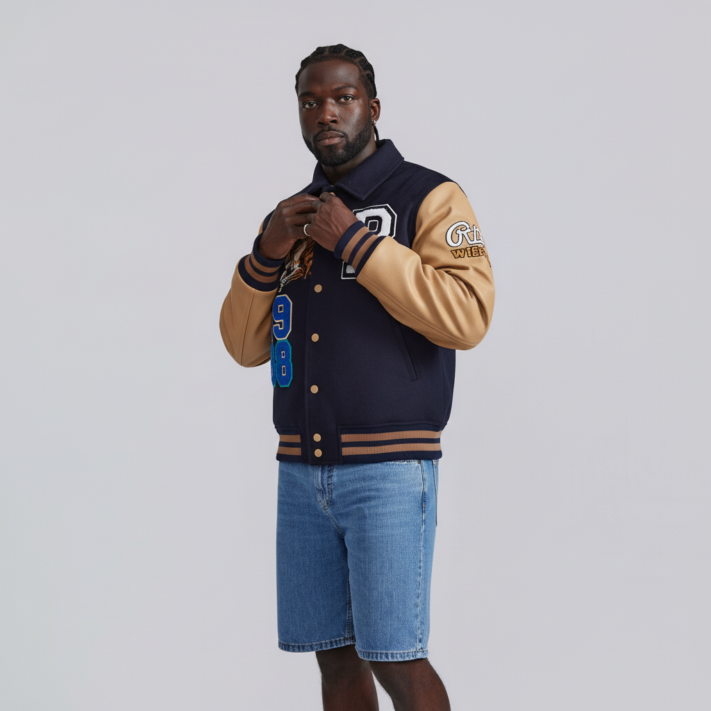 - A navy wool‑blend body paired with beige leather sleeves